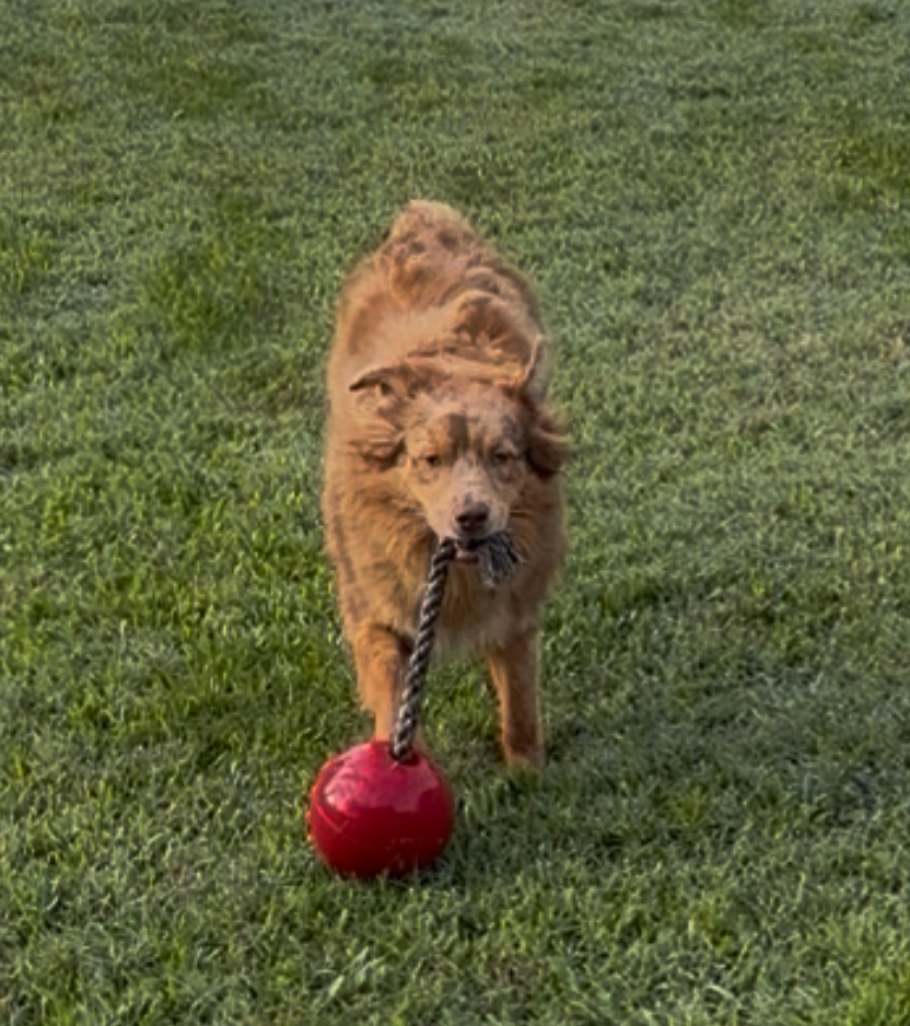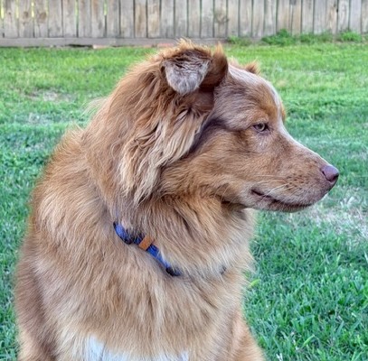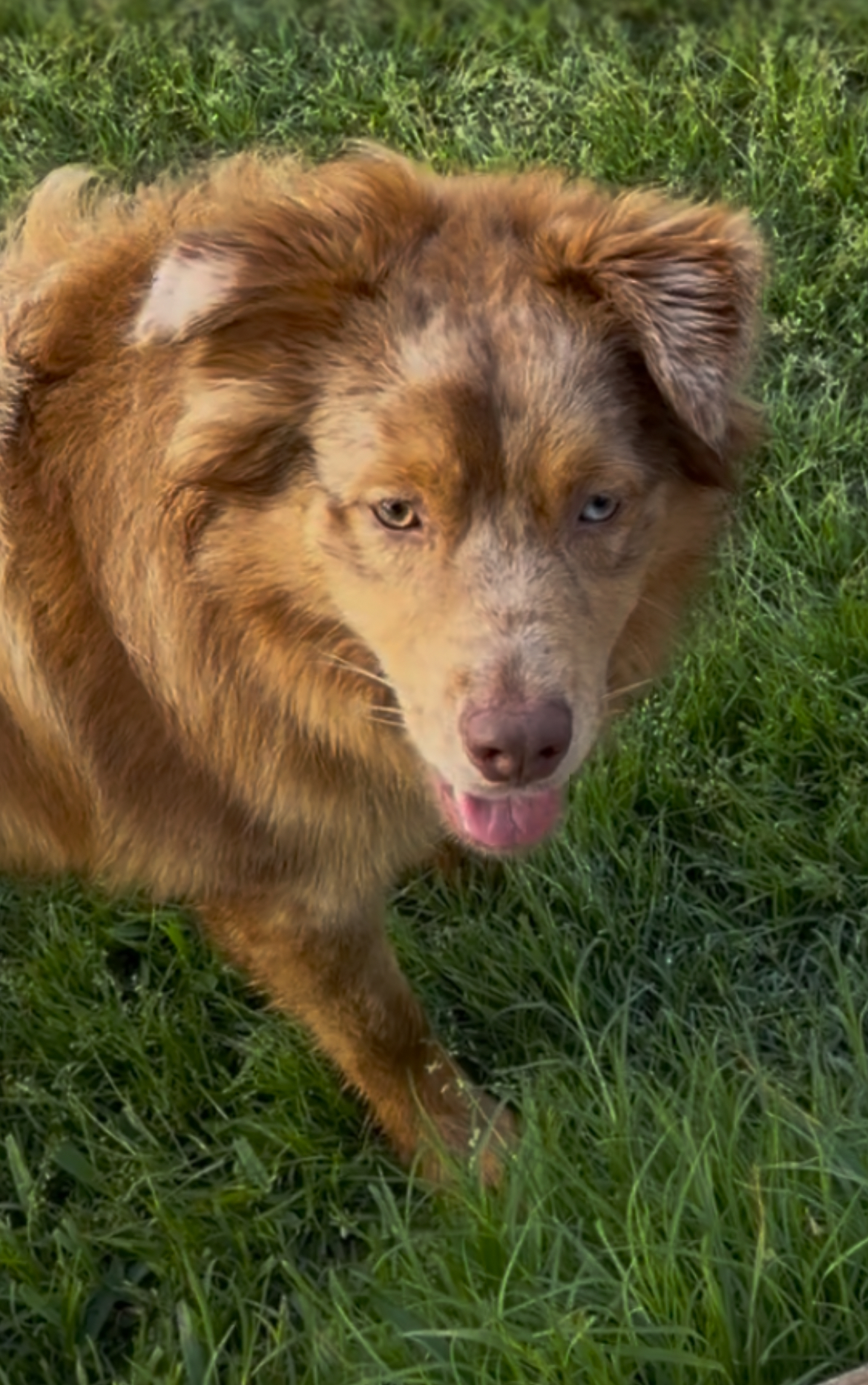I’m a fun-loving red merle Australian Shepherd who will turn 1 year old on April 29th, and I weigh about 42 pounds of pure Aussie energy and charm. My foster mom says my coloring is super unique—and my eyes are pretty special too. One is the color of the earth, and the other is the color of the sky!