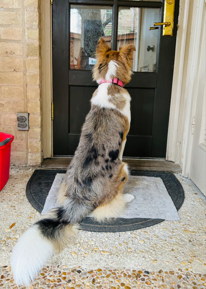 She is doing great with potty habits when given regular outdoor access and will go to the door when she’s ready to come back inside. Lucy is also crate trained and finds comfort in her crate, especially when it’s made cozy and den-like.