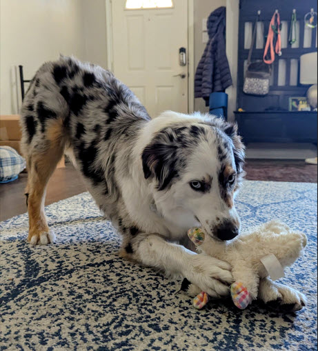 Camo is smart and eager to learn but with gentle guidance, especially when training sessions are short, focused, and fun. She’s working on holding attention, so brief bursts of training help her stay engaged and successful. She’s currently improving her leash walking, although she gets very excited when she sees other people or dogs. She doesn’t appear to have a strong interest in cats. She is learning to “drop it” rather than wander around the backyard with her prized stuffies and is getting better at sitting on command rather than only using contextual clues. Because Camo was spayed recently, we’ve been playing a lot of sniff games so she’s enjoying learning how to follow her nose on purpose. We are also working on building her confidence, especially around loud noises and thunder where reassurance and positive reinforcement help her feel safe.